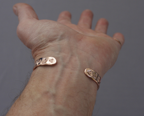 Je réalise ce bracelet cuivre Triskell artisanal à partir d’une bande de cuivre massif que je martèle avec soin. Le martelage donne au métal une texture vivante, qui capte la lumière et rend chaque pièce unique. Ensuite, je grave manuellement le symbole Triskell à l’aide d’un poinçon, selon une technique inspirée de la dinanderie traditionnelle. Le résultat est à la fois brut et raffiné, entre modernité et héritage.